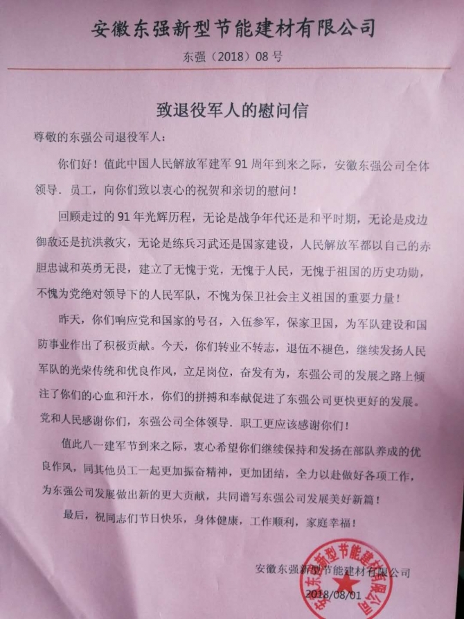 今天迎來中國(guó)人民解放軍建軍91周年,安徽東強(qiáng)公司全體領(lǐng)導(dǎo)、員工,向祖國(guó)最親愛的子弟兵致以衷心的祝福,同時(shí)向公司退伍軍人表達(dá)親切的慰問。